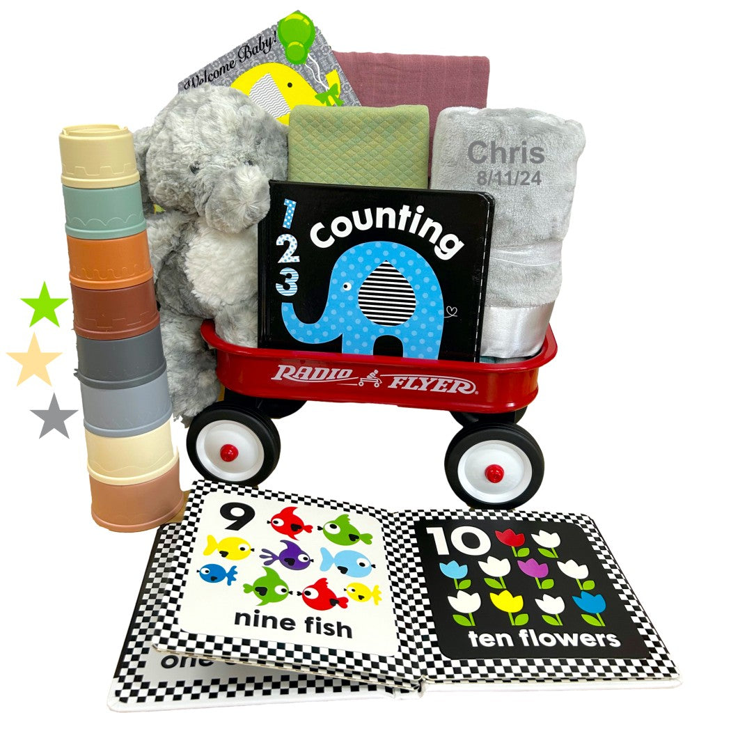 All aboard the Educational Elephant Express Wagon! This thoughtfully curated gift set is designed to inspire curiosity, comfort, and fun in the early years of a child's life. Presented in a classic red wagon, this charming collection of baby essentials and educational toys is perfect for new parents looking to create lasting memories.
